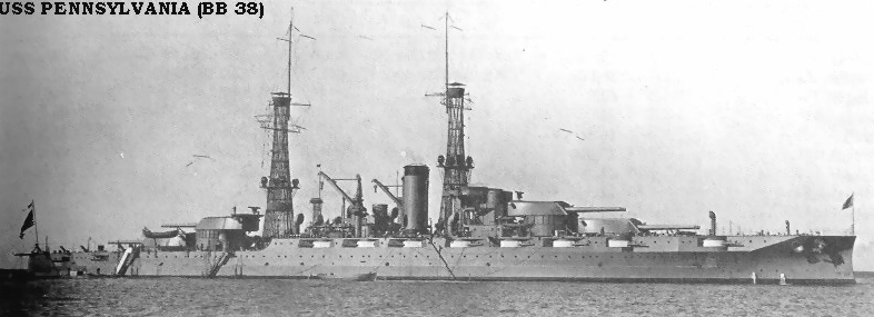 Характеристики броненосца "Пенсильвания": Страна: США Вооружение: пушки,торпеды Толшина брони : 3-18" Длина корпуса: 185.4 м Ширина корпуса: 29.6 м Водоизмещение: 32567 т Осадка: 8.8 м Двигатели: 31500 л.с. Макс. скорость: 21 узл Экипаж: 915 чел Год принятия на вооружение: 1916